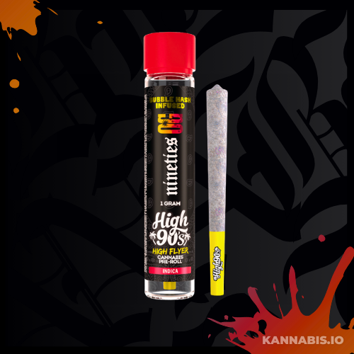 Take it back to the '90s. High 90's Nineties OG High Flyer is a bubble hash infused pre-roll packing 36.78% THC with classic OG flavors β earthy, piney, and gassy. Deep Indica relaxation for experienced consumers.