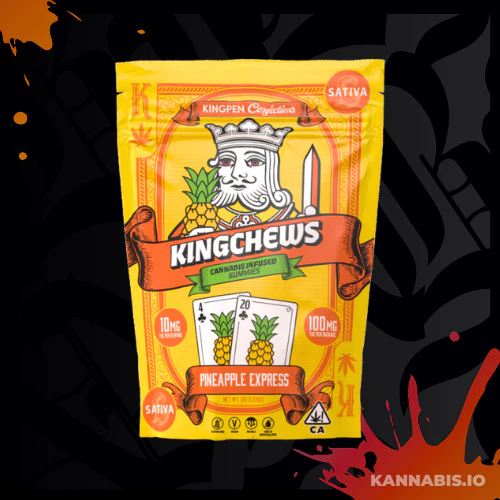 Ride the tropical wave with KingChews Pineapple Express gummies — a Sativa-infused treat that delivers uplifting, energizing effects. Each package contains 100mg THC total with 10mg per serving, perfect for precise dosing.