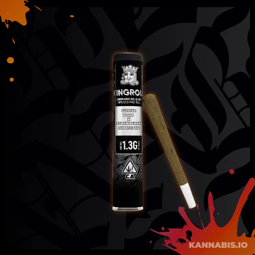 Kingroll 1.3-Gram Infused Pre-roll in Glitter Bomb x Strawberry Shortcake. Premium joints made with whole nug flower, infused with Kingpen cannabis oil and coated in golden kief. Highly potent with sweet strawberry and creamy dessert flavors. Perfect for relaxation.