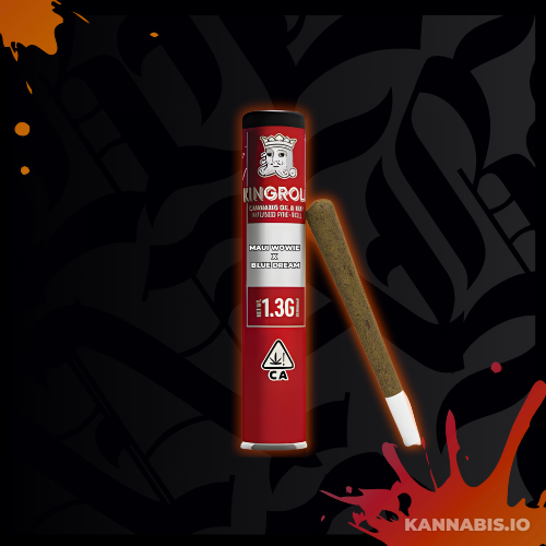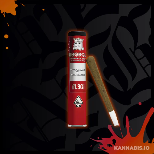 Kingroll 1.3-Gram Infused Pre-roll in Maui Wowie x Blue Dream. Handcrafted with complementary strains and oil pairings for a flavorful sativa experience. Tropical pineapple meets sweet berry for an uplifting, creative high. Perfect for daytime sessions.