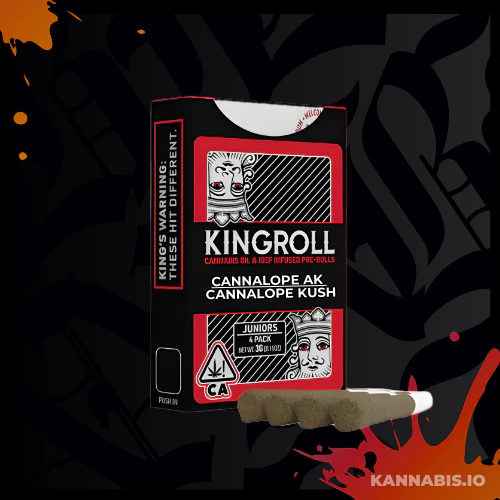 Kingroll Juniors Variety 4-Pack (4 x 0.75g = 3g total) featuring Cannalope Kush v3 blends. Includes: Cannalope AK x Cannalope Kush, Mango Kush x Cannalope Kush, White Rhino x Cannalope Kush, and Watermelon Z x Cannalope Kush. Premium infused joints with whole nug flower, Kingpen cannabis oil, and golden kief coating.