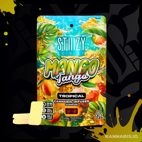 STIIIZY Mango Tango Gummies. Premium 100mg pack (10x10mg) of tropical mango-flavored sativa gummies. Each piece delivers consistent, uplifting effects perfect for controlled dosing and exotic flavor.