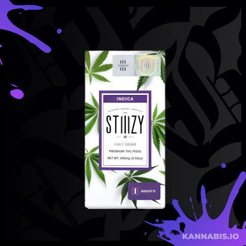 STIIIZY Biscotti Pod. Premium 0.5-gram indica pod with sweet cookie flavors and diesel undertones. This Cookies family classic delivers a heavy, relaxing high with cerebral euphoria that melts into full-body sedation. 85.76% THC.