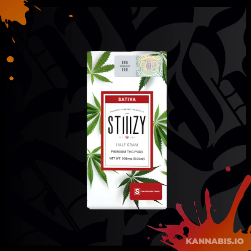 STIIIZY Strawberry Cough Pod. Premium 0.5-gram sativa pod delivering sweet strawberry flavors with spicy undertones. Known for its distinctive aroma and uplifting effects that spark creativity and energy.