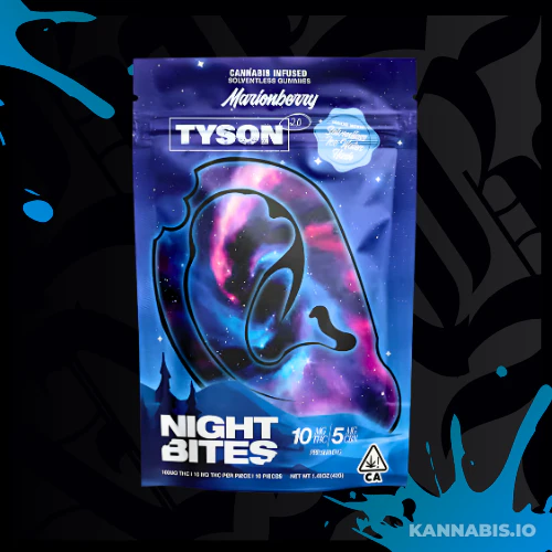 Tyson 2.0 Night Bites Solventless Gummies in Marionberry flavor. Premium indica-infused sleepytime gummies crafted with high-quality solventless cannabis extract. Each ear-shaped gummy delivers 10mg THC + 5mg CBN for the perfect relaxing nighttime experience. Designed to help you unwind and drift off to sleep.